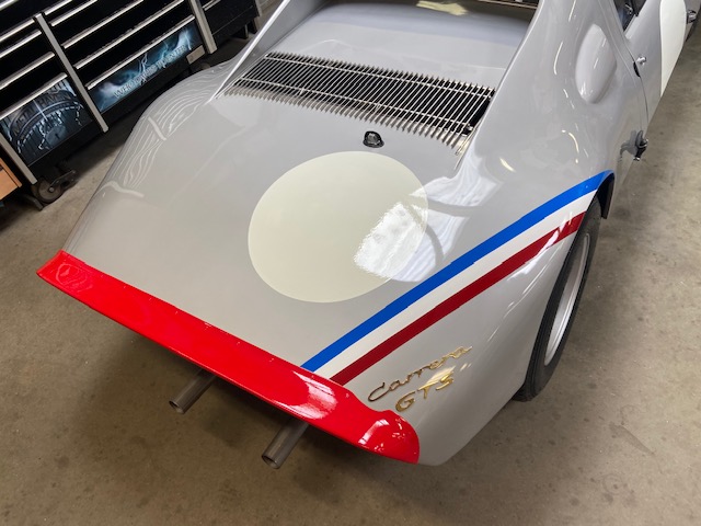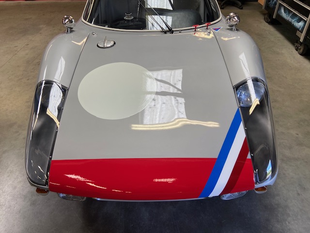 Once finished we had the car returned to it’s 1965 Reims 12hrs livery by hand painting the bonnet and clamshell flashes, tricolore’s and as numbers and roundles.