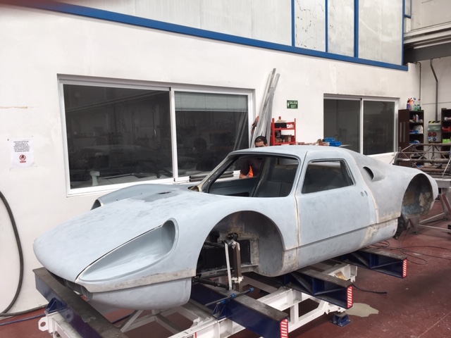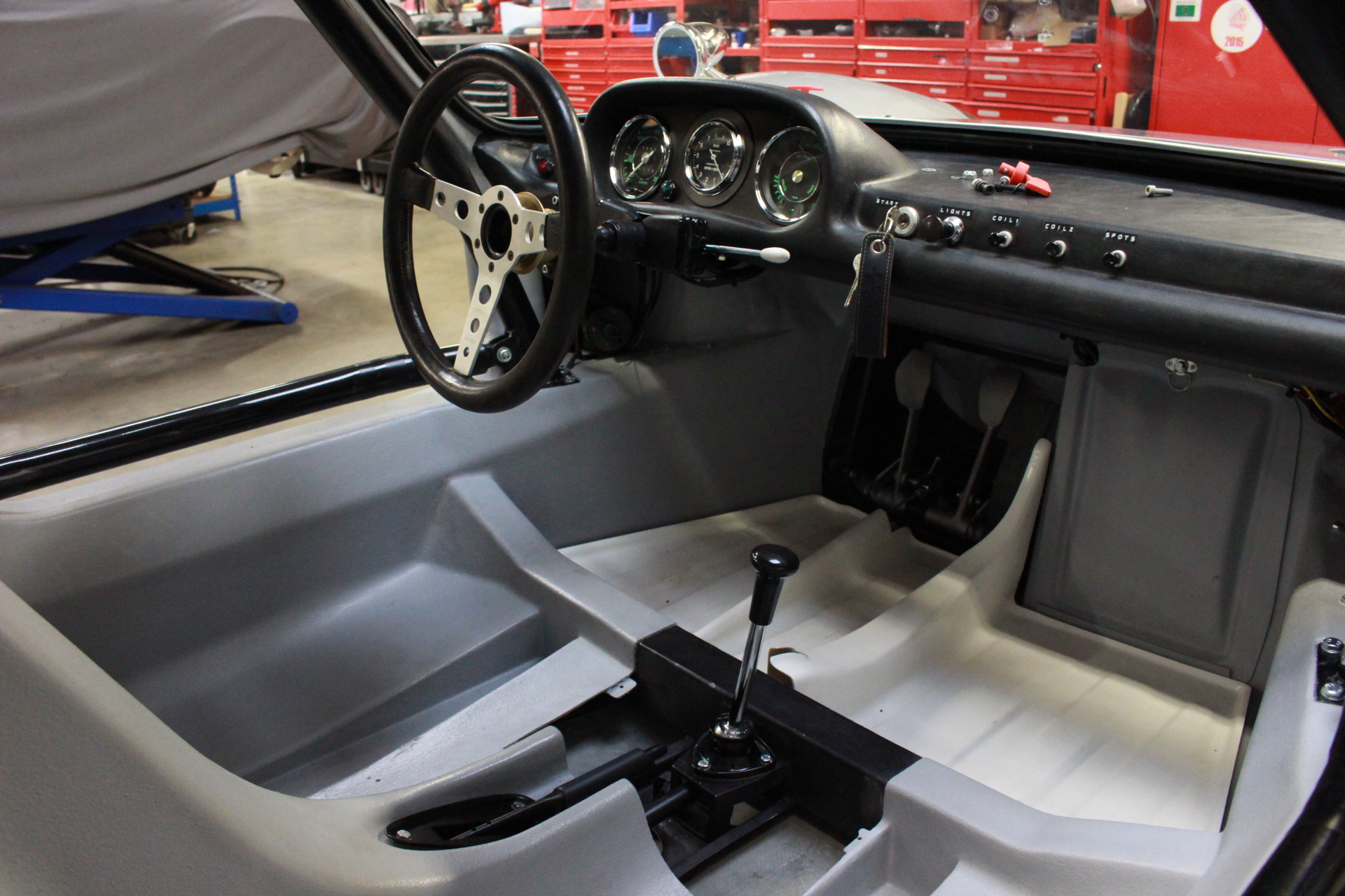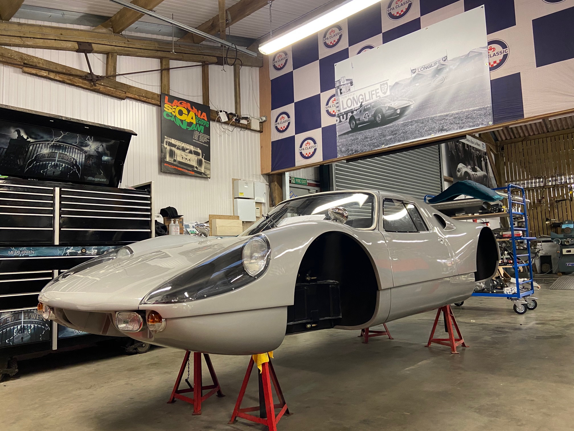 Once purchased we set about placing the chassis on a jig to ensure all suspension points etc were in the correct places. We had to make a few small repairs to the chassis to make it as it should be. Once the repairs had been made the fibreglass body was constructed and fixed around the chassis exactly as the cars were built in period. The body was then painted in its original colour of GT Silver metallic.